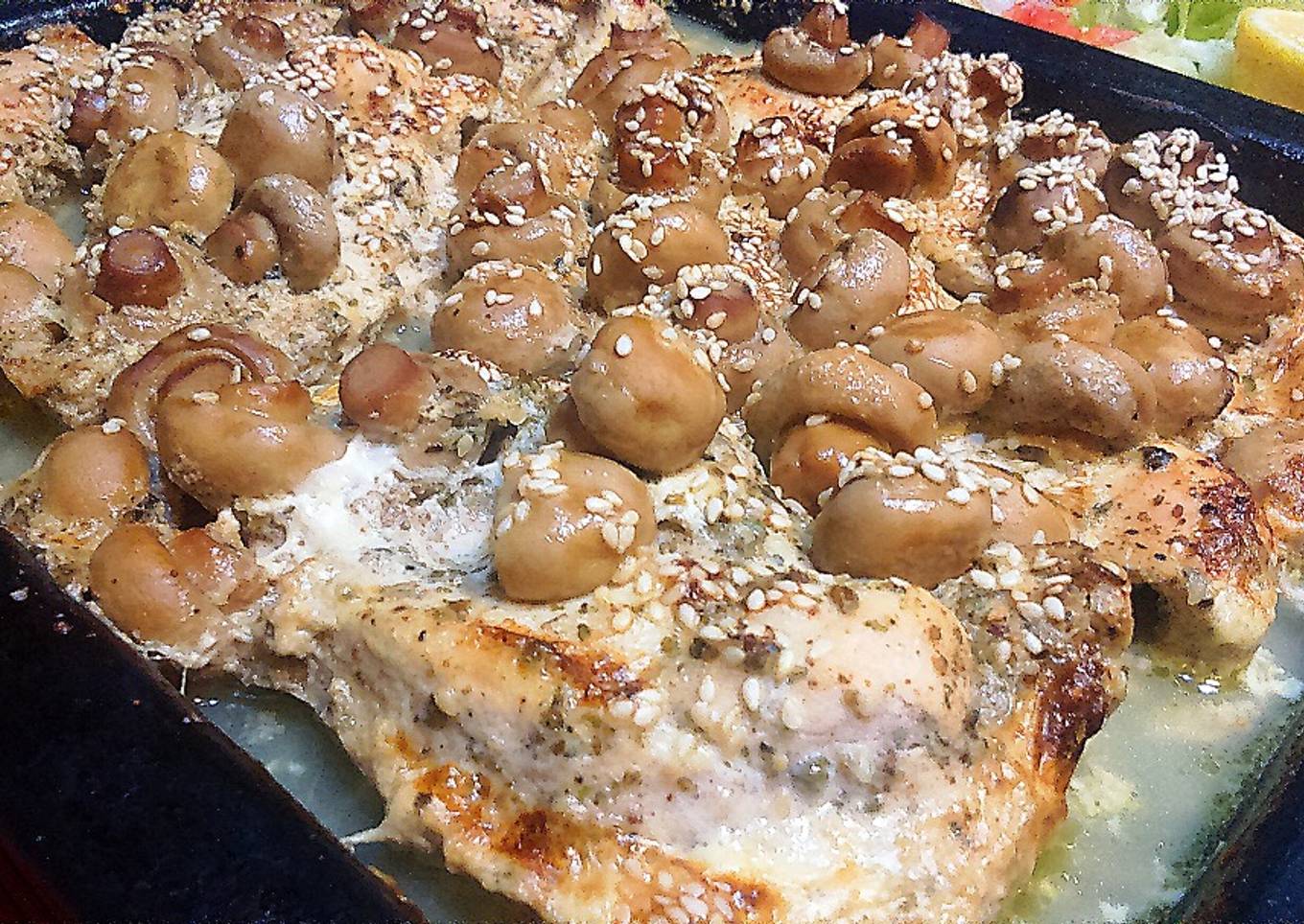 - Luego poner en la bandeja del horno la pechuga de pollo macerado y agregar encima la cabeza de ajo picada, los champiñones y el sésamo, vaciar el juego que produjo la pechuga en el bowl encima de la preparación